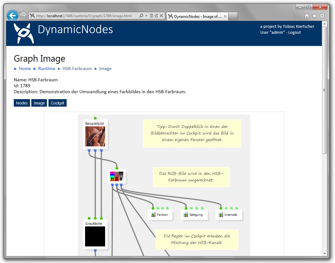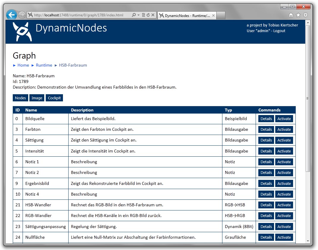 Als kleines Weihnachtsgeschenk hat DynamicNodes nun den ersten Entwurf einer Web-Schnittstelle bekommen. (Dabei war das Web-Framework NancyFX von großer Hilfe.) Über die Web-Schnittstelle können die geladenen Graphen und ihre Knoten aufgelistet und inspiziert werden, die grafische Darstellung des Graphen kann geladen werden und was für mich am wichtigsten ist: Das Cockpit eines Graphen kann über die Web-Schnittstelle bedient werden. Damit eröffnet sich die Möglichkeit, Daten über das Internet in einen Graphen einzugeben und die Ergebnisse abzurufen. Es lässt sich so auch einfach eine WebCam realisieren.