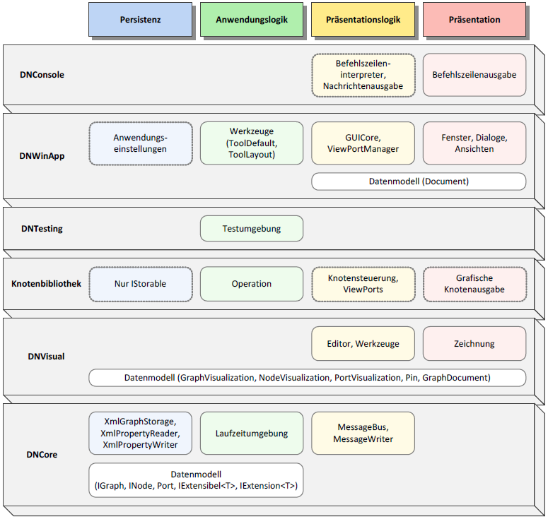 Eine Sonderrolle nehmen die Knotenbibliotheken ein, welche für die enthaltenen Knotentypen Funktionalität aus allen vier Schichten mitbringen können.